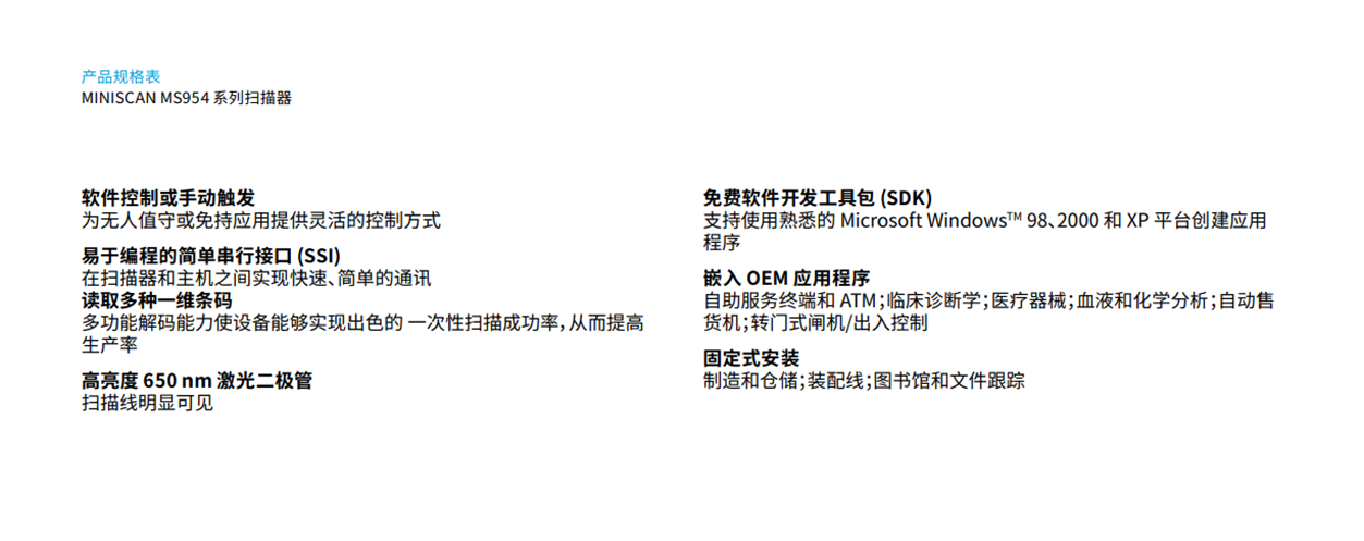 作為如今市面上一款小巧、輕盈、明亮的固定式掃描器,MS954 非常適合空間受限的 OEM 設備,例如自助服務終端、ATM、臨床診斷設備、醫療儀器和閘機/門禁。