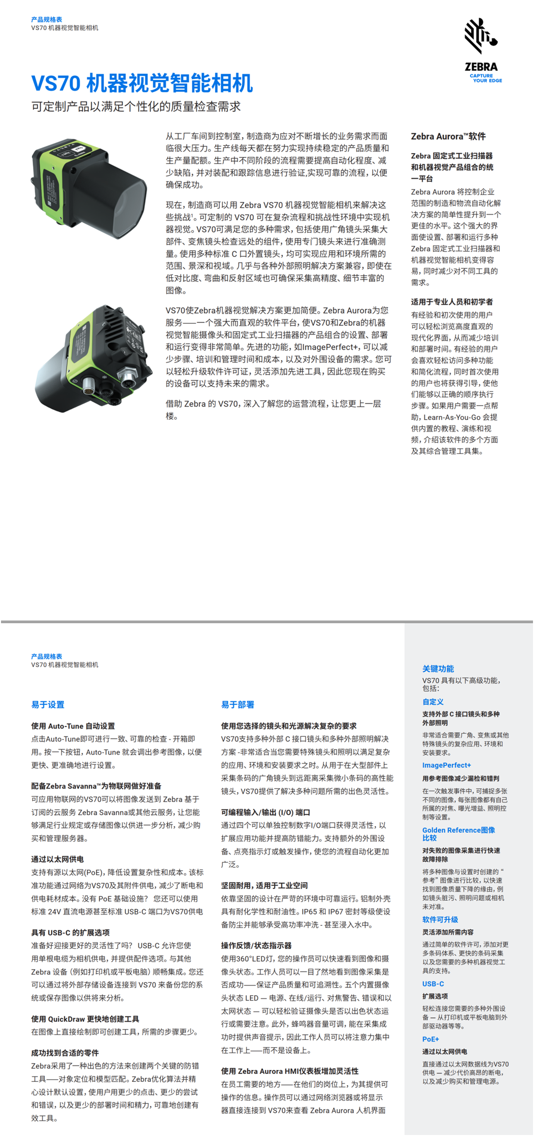 可定制的 VS70 可應對復雜的流程和環境挑戰。當您需要廣角鏡頭采集大部件、變焦鏡頭檢查遠處的組件,或是需要專門鏡頭來進行準確的測量時,VS70 可滿足您的需求。購買軟件許可證即可升級到更先進的功能。此外,借助 Zebra Aurora 軟件平臺,您可以輕松設置、部署和運行 VS70,以及 Zebra 的工業級機器視覺及固定式掃描器產